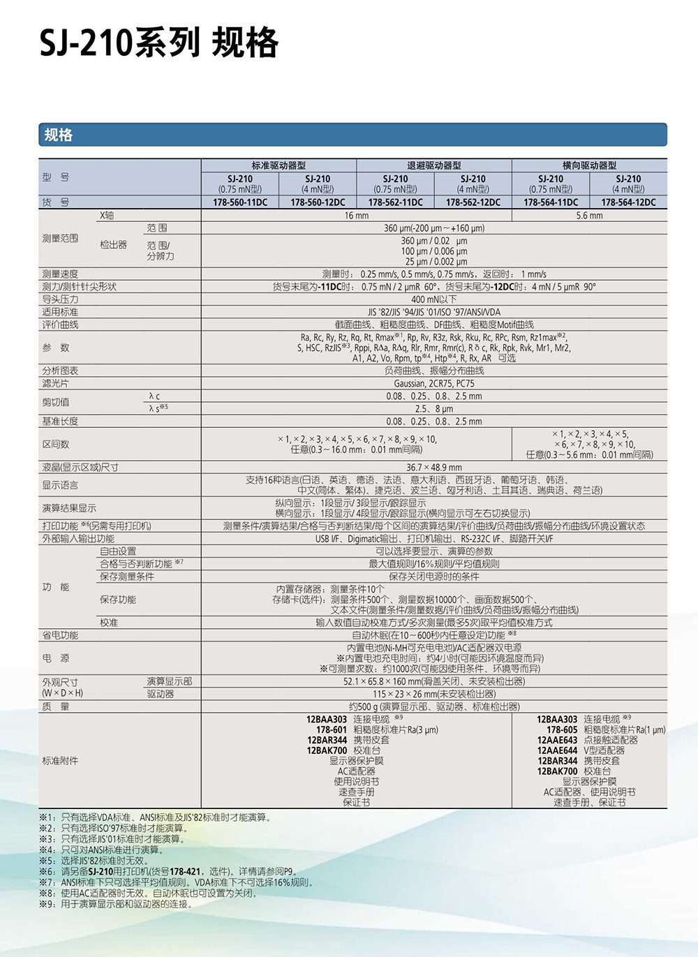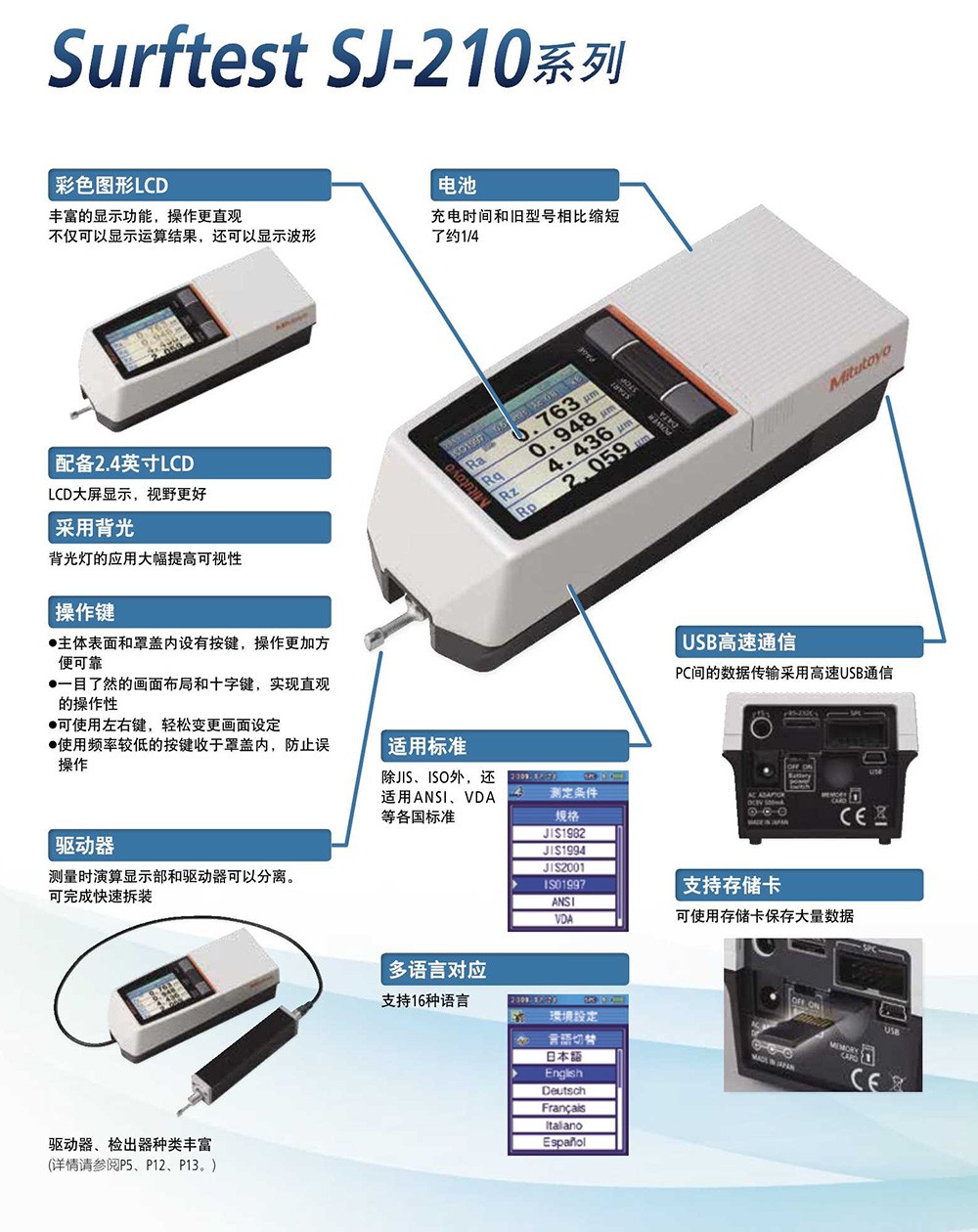 SJ210粗糙度仪(日本三丰Mitutoyo)作为日常工具使用的便携式表面粗糙度仪,适合现场使用,重量轻巧、操作简单、测量精度高;大型的LCD文字表示,易于清晰读取;检出器的量测范围扩大为350μm;检出器的驱动部有退避功能;可对应新/旧 JIS、DIN、ISO、ANSI的各国粗度规格;拥有丰富的参数:自动校正机能、合否判定机能、客户自行编辑设计机能。