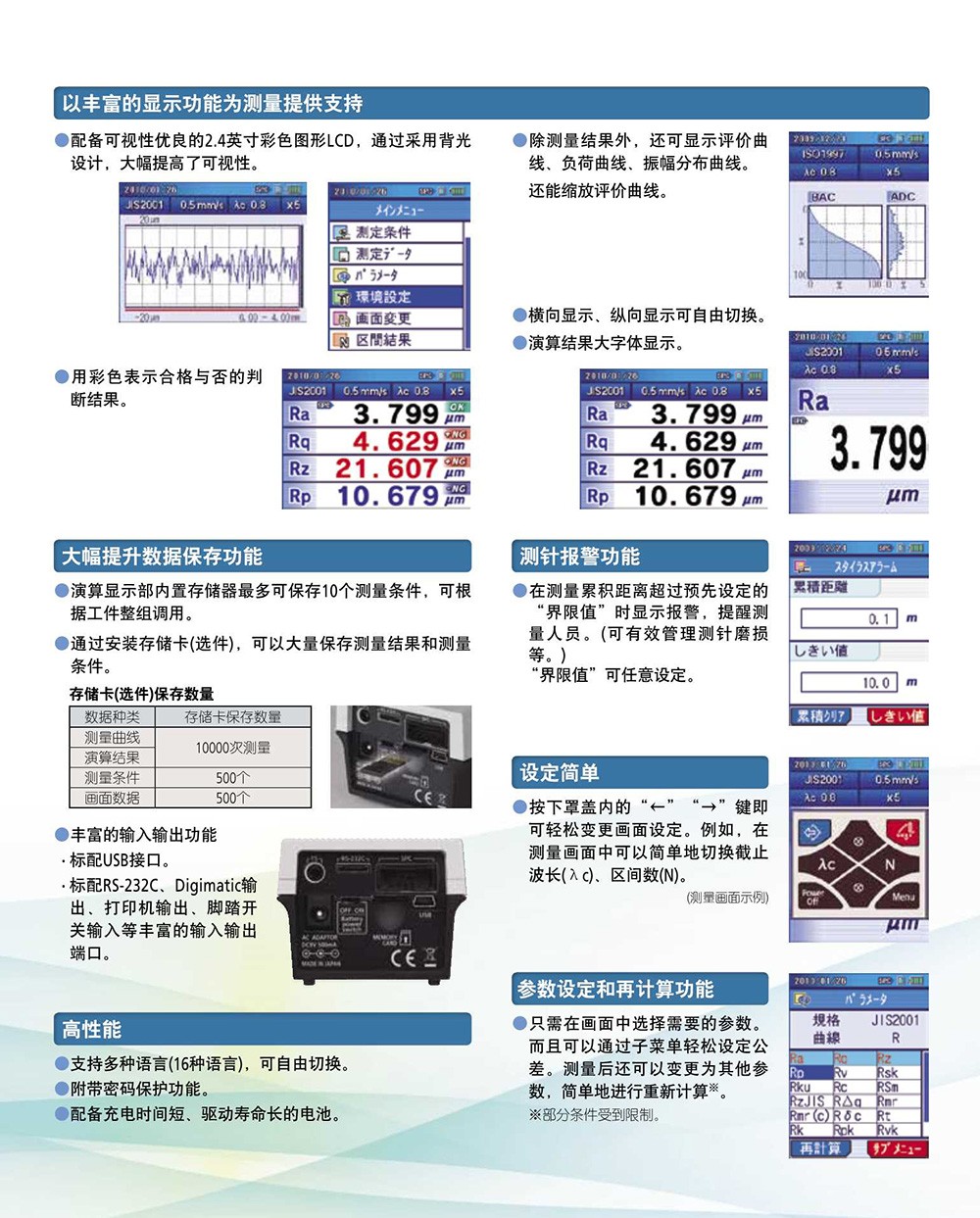 · 提供包括基础参数 Ra,Rq,Rz,Ry 在内的 19 个分析参数。